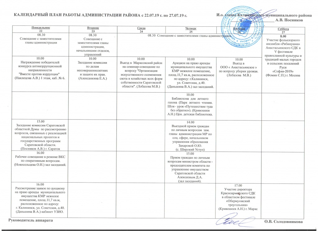 План работы администрации Калининского МР с 22.07.2019 по 27.07.2019