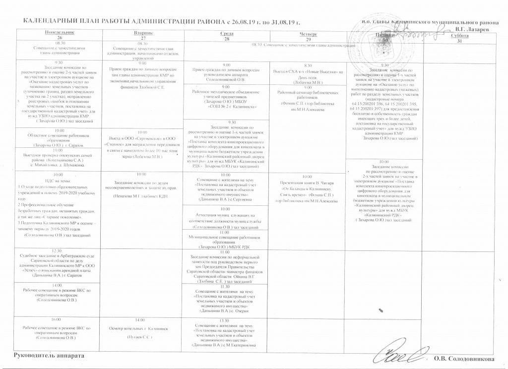 План работы администрации Калининского МР с 26.08.2019-31.08.2019