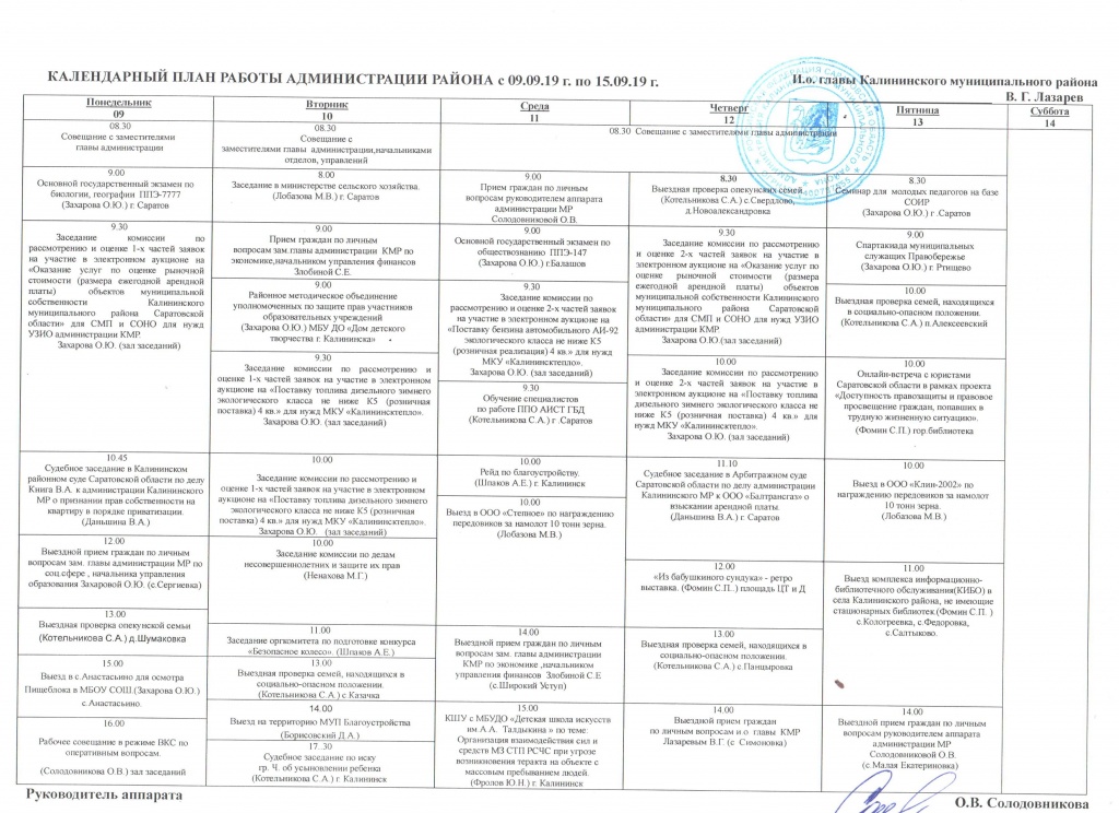 План работы администрации Калининского МР с 09.09.2019-15.09.2019г